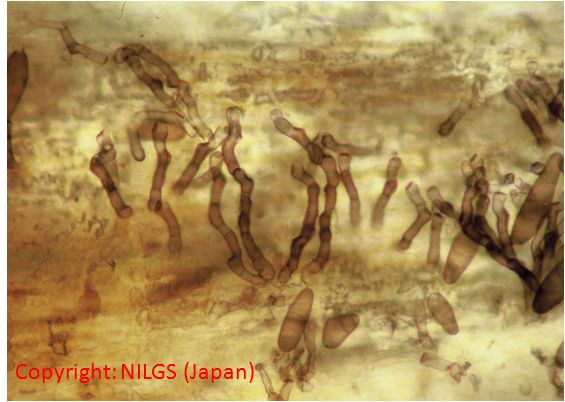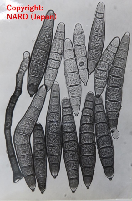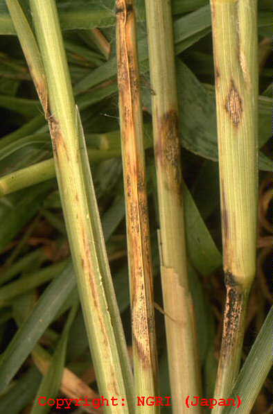 暖地で発生の多い穂枯性の糸状菌病。出穂後、穂が灰色から黒色の菌叢に覆われ、枝梗が互いに接着された状態となり、穂全体がかびる。葉には白色の菌叢が葉脈に沿って条状に現れる。病原菌はエピファイト(表生菌)として植物表面に感染し、感染植物は耐虫性を持つようになることが報告されている。 |