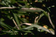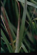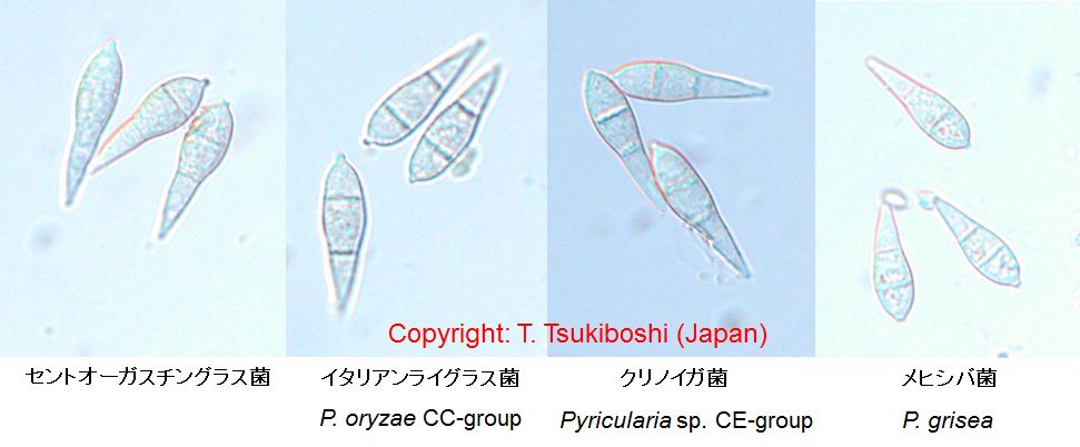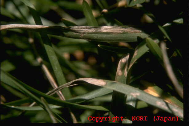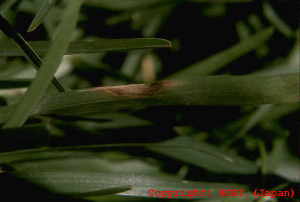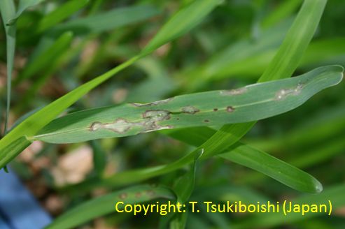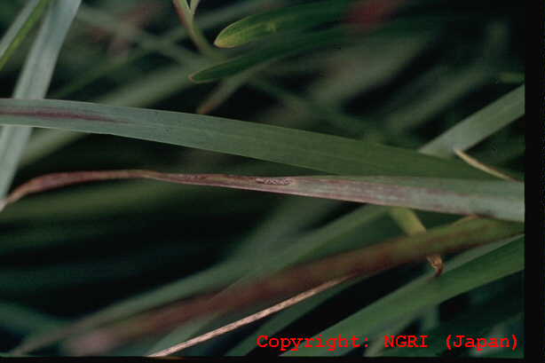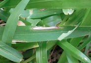 2008年に熊本県、2012年に沖縄県での発生が報告された。病斑は紡錘形、周縁部灰褐色、中心部灰白色で、大きさ2-10×1-2mm、後に拡大・融合して20×5mm程度に達する。病原菌はイネ菌およびライグラス菌等と同じP. oryzae CC-group(栽培植物寄生菌群)に属するが、イタリアンライグラスには病原性を示さない。 |