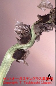 1998年5月に沖縄県今帰仁村の芝地で発生を確認した。病徴は出穂開花後に種実が黒穂化し,表面は初め灰色の薄い外皮に被われるが,すぐに破れて黒粉(黒穂胞子)を飛散する。穂のほとんどすべての種実が侵されるため,穂は濃褐色粉状を呈する。やがて黒穂胞子はすべて飛散し,花軸だけが残る。 |