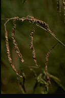 Bacterial disease. Lesions are at first ash white, small oval lesion in a young leaf. Later it gradually extends long along leaf veins, and it becomes a reddish brown, long stripe. The lesion part becomes thin like a paper and to split easily. A lot of bacteria are detected from the infected leaf, and they disperse and transmit by wind and rain, etc. The causal bacteria parasitize in many kinds of gramineous plants, such as corn, rice, foxtail millet, African millet, millet and etc.