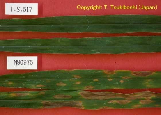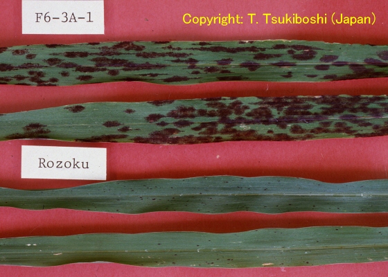 | 病徴(葉) | 接種病徴(上:罹病性,下:抵抗性系統) | タンカラー系統への接種病徴 (上:抵抗性,下:罹病性) |
