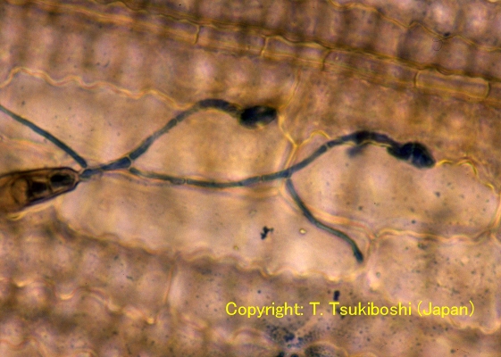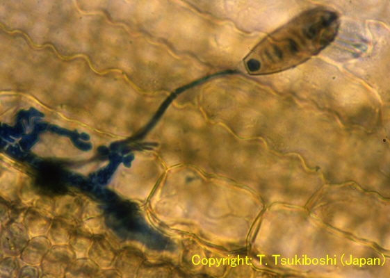 | 分生子 | 発芽管と付着器 | 付着器からの侵入菌糸 |
