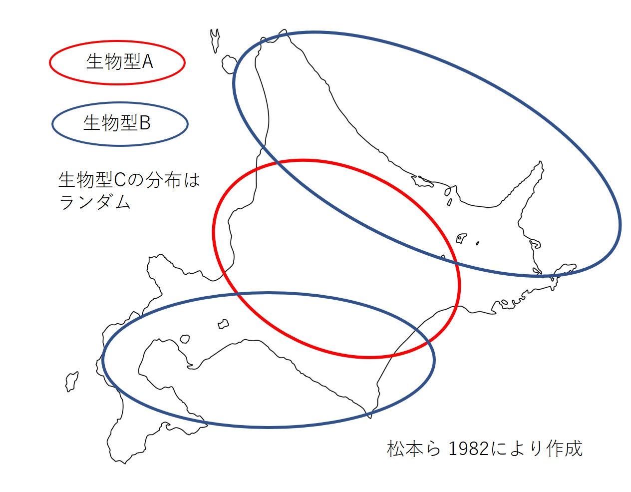 黒色小粒菌核菌の北海道での分布について、菌交配の有無により類別される生物型(バイオタイプ)は、A型は腐生性がより強く、積雪期間が長い内陸部に分布し、B型は病原性が強く、土壌凍結期間の長い沿岸部に分布する(左図、松本ら 1982a, 1983c, 1984a)。それぞれの生物型群内の交配は2対の不和合性因子により支配されており(松本ら 1983b, 松本・但見 1989a, 1989c, 1993a)、生物型BとCは不和合性因子を共有することから、両者は積雪条件に適応した連続変異を示す一つの生物種と推定されている(松本・但見 1993c)。土壌凍結が発生条件となる大粒菌核病菌もB型と同様の分布を示し、C型の分布は道内ではランダムである。しかし、温暖化が進んだ現在では分布は変化している可能性がある。 |