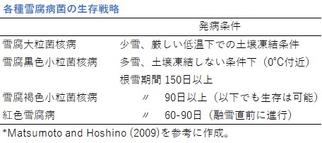 ![]() 図1. 各種雪腐病菌の生存戦略 |