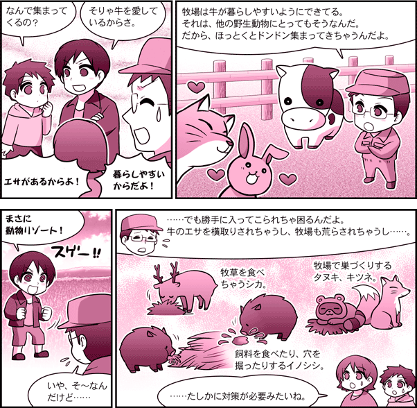 農研機構【ガイドコミック】 第3話・牧場と野生動物 ~どうやって共存する?~ 目次へ