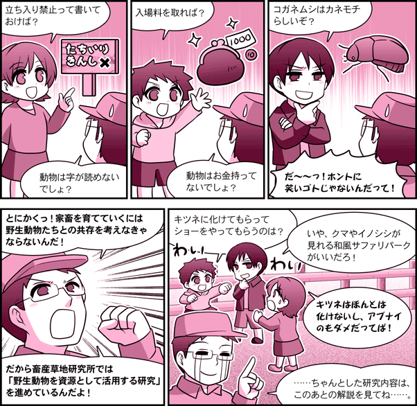 農研機構【ガイドコミック】 第3話・牧場と野生動物 ~どうやって共存する?~ 目次へ