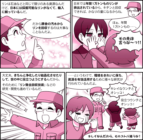 農研機構【ガイドコミック】 第7話・豚舎の汚水からリンを除き回収して利用する技術 目次へ