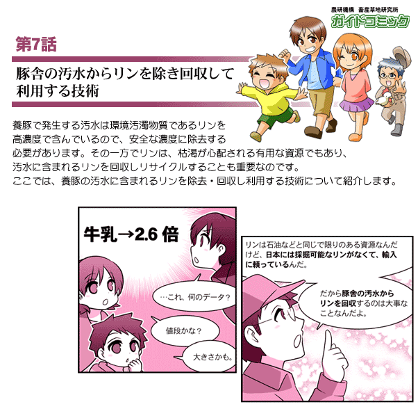 農研機構【ガイドコミック】 第7話・豚舎の汚水からリンを除き回収して利用する技術 目次へ