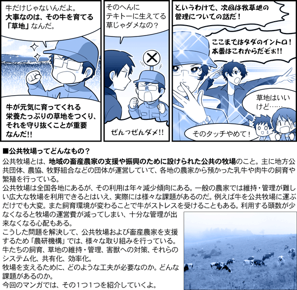 農研機構【ガイドコミック】 放牧研究編 第1話・公共牧場って、どんなトコ? 目次へ