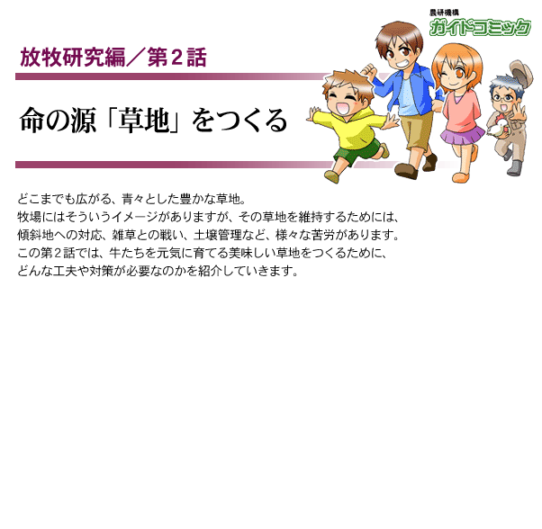 農研機構【ガイドコミック】 放牧研究編 第2話・命の源「草地」をつくる 目次へ
