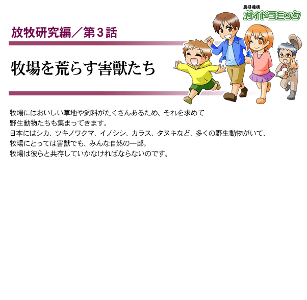 農研機構【ガイドコミック】 放牧研究編 第3話・牧場を荒らす害獣たち 目次へ