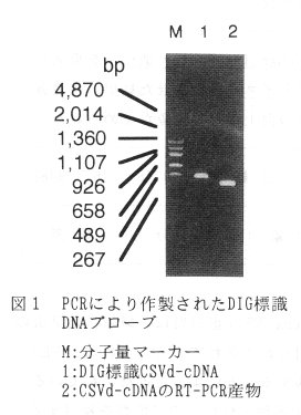 - CSVd遺伝子をRT-PCRで増幅し、pUC119のSmaⅠサイトにクローニングし、これを鋳型にPCRでDIG標識プローブを作製する(図1)。