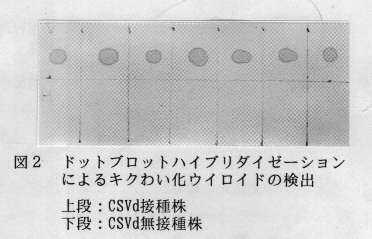 - キクわい化ウイロイド(CSVd)の遺伝子をクローニングし、そのクローンを鋳型としPCRでDIG標識DNAプローブを合成する。このプローブを使いドットブロット ハイブリダイゼーションでCSVdを検定すると迅速、高感度に検出することができる。
