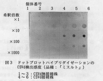 - CSVd接種株は青紫のスポットを示すが、無接種株はスポットができない(図2)。接種試料を段階希釈し、検定すると100倍から1,000倍の希釈でも陽性反応が確認できる(図3)。