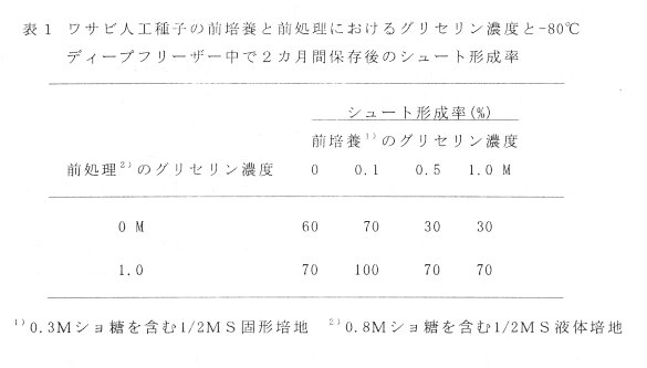 - 茎頂の前培養は0.1Mグリセリン+0.3Mショ糖を含む1/2MS固形培地で、前処理は1.0Mグリセリン+0.8Mショ糖を含む1/2MS液体培地が適しており、-80℃で2か月間の保存後も100%のシュート形成率である(表1)。