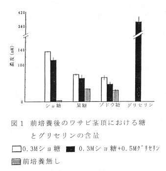 - 前培養後のワサビ茎頂に含まれる糖、グリセリンを液体クロマトグラフで定量したところ、ショ糖、果糖、ブドウ糖とも無処理の茎頂より多く、特にショ糖は約30倍であった。また、0.5Mグリセリン添加の前培養では約0.4Mのグリセリンが含まれる(図1)。