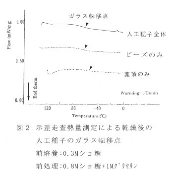 - 乾燥後のビーズ全体、ビーズのみ、茎頂のみにおけるガラス転移点を示差走査熱量計(DSC)で測定したところ-50~-60℃であった(図2)。したがって、-80℃で保存中の人工種子はガラス化していることが確認できた。