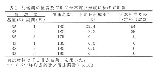 - 広島菜(Brassica campestris)の葯培養は、1核期前期の未熟花粉を含む葯を、生長調節物質を含む修正B5培地に置床し、35℃1日間の前処理後、25℃暗黒下で培養すると、効率的に不定胚を形成し、植物体再生が可能である。