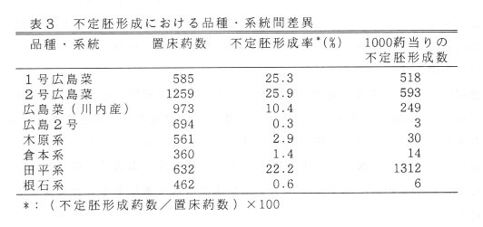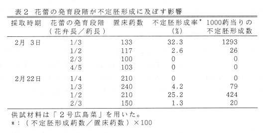 - 不定胚形成に適した葯は,1核期前期の未熟花粉を含む葯で、花蕾の発育段階は、花弁長/葯長の比が1/3~1/2である(表2)。また,不定胚形成には、品種・系統間差が認められ、不定胚形成が良好な品種では、不定胚形成率が20%以上、1000葯当りの不定胚形成数が500個以上である(表3)。