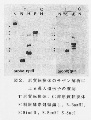 - 上記の方法により、NPT-II(カナマイシン抵抗性)遺伝子とGUS遺伝子を導入した不定胚形成細胞0.8gをジェネティシン添加培地で選抜することにより、形質転換植物を1個体得ている。