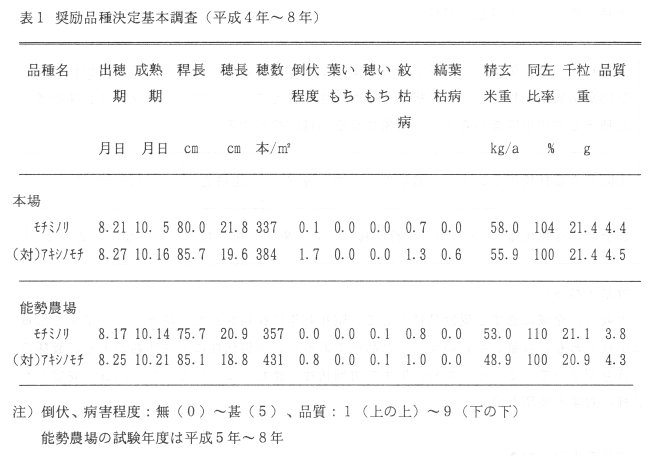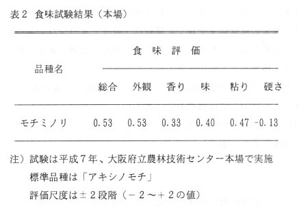 - 「モチミノリ」は、早生の偏穂重型品種で、縞葉枯病抵抗性などの耐病性を備えている。「アキシノモチ」に比較して、早熟で倒伏に強く、収量性はやや高く、品質も安定し、食味が優るので、府下全域を対象に奨励品種に採用する。