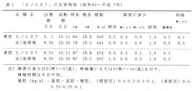 - 倒伏に強いが、縞葉枯病には罹病性である(表1)。