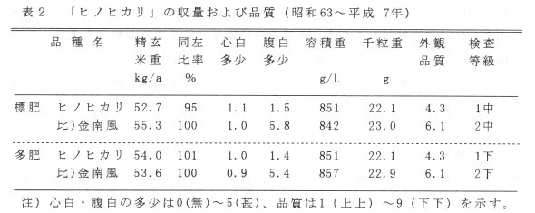 - 「ヒノヒカリ」は「金南風」より成熟期はやや遅く、収量性はやや劣るが、強稈で外観品質が良く、食味も良好であることから、兵庫県南部向けの中生品種として認定品種に採用した。