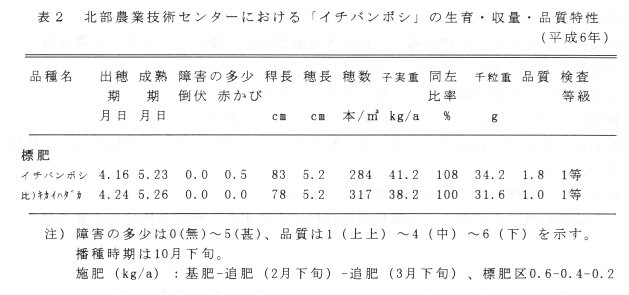 - 倒伏にはやや弱く、赤かび病抵抗性は中程度である。収量は高く、品質も良い(表1、2)。