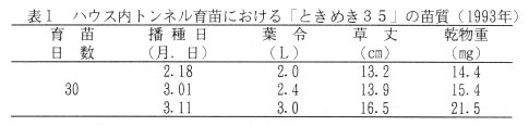 - 育苗は、2月下旬~3月上旬に播種し育苗器で出芽させた後、ハウス内に設けたトンネル内で行う。無加温でも約30日で稚苗が得られる(表1)。