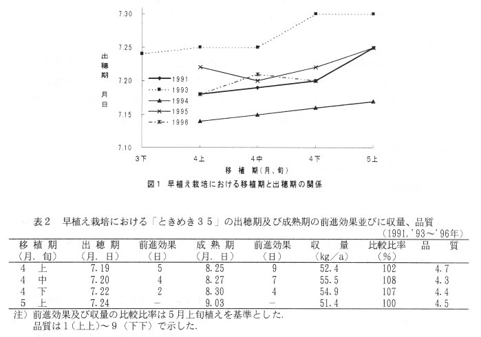 - 本県で育成した「ときめき35」は良食味米として市場評価が高く、また、「コシヒカリ」より成熟期が早いため早場米として期待されているが、本県の一般栽培である5月上旬移植では、9月上旬収穫となることがある。そこで、本県平坦部を対象に「ときめき35」を3月下旬~4月上旬に移植し、8月中に安定して収穫する早植え栽培について検討した。
