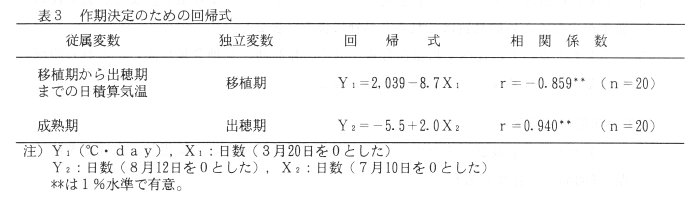 - 移植期から出穂期までの日積算気温は、移植期が遅くなるほど少なくなり、移植期を独立変数とする1次回帰式によく適合する。また、成熟期は出穂期を独立変数とする1次回帰式によく適合する(表3)。この式を用いて「ときめき35」の8月中収穫・出荷のための作期を決定することができる。