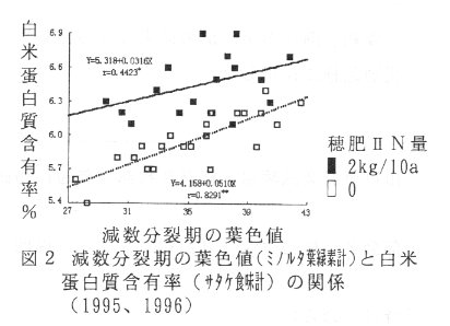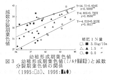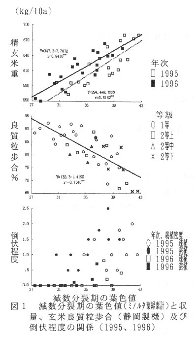 - 減数分裂期の葉色は収量、品質、耐倒伏性との関係が大きく、良質安定化のためには減数分裂期の葉色値は36~37に保つことが重要である。