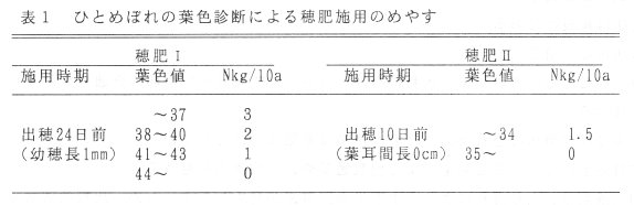 - 本めやすは普通化成肥料を用いての成績であるので、堆厩肥の多施用、緩効性肥料施用水田等では肥効の出方を考慮して利用する。