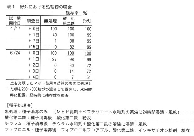 - 酸化第二鉄の粉衣は一時的な忌避効果があるものの、野外で無処理の籾が減少した場合、あるいはケージ内で他に餌ない場合は顕著に喫食される。