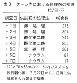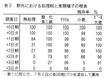 - スズメはビール大麦や小麦種子より籾(無処理)に対する嗜好性が高い。ビール大麦は吸水して膨軟な状態となれば顕著に喫食されるが、乾燥した状態では酸化第二鉄を粉衣した籾より喫食され難く、チウラム水和剤を処理した籾より喫食され易い(表2)。