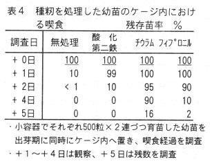 - この処理は、出芽後の胚乳の喫食に対しても高い忌避効果がある(表4)。しかし、喫食の抑制は籾の場合より劣る。また、幼苗の引抜き自体は防止できない。
