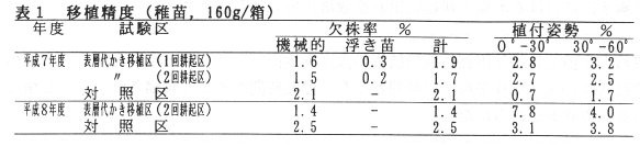 - 表層代かき移植区では、春耕起後の圃場で移植4~5日前に入水し、植付・施肥を行うが、対照区と比べ植付姿勢がやや劣るものの、実用性に問題は認められない(表1)。