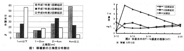 - 秋期・春期の二回耕起では、移植時の再生雑草も少なく、砕土状況も良好なため、田面水中へのペースト肥料の溶出も少ない(図1・2)。