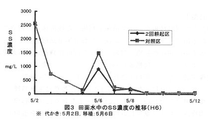- 表層代かき移植区は、慣行の代かきによる濁水の発生もなく、移植直後のSS(懸濁物質)濃度も低いため、濁水流出の危険が低いと考えられる(図3)。また、一筆減水深(平成8年度)は、表層代かき移植区が2.7cm/day,対照区が2.1cm/dayと表層代かき 移植区がやや多くなる。