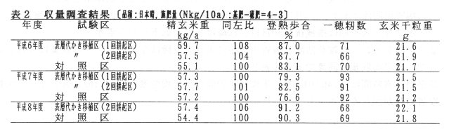 - 表層代かき移植区の精玄米重は、対照区と同程度である(表2)。