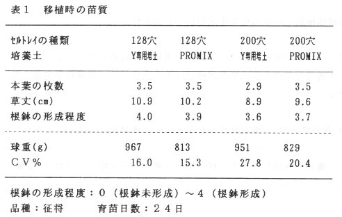 - 5月播種の128穴、200穴のセルトレイを利用した育苗では、同じ培養土を使用した場合128穴トレイの育苗が本葉の枚数が多く、草丈は長く、根鉢の形成程度は高くなる。しかし機械移植した場合、収穫時期の球重は、128穴と200穴ともにほとんど差が無くなる(表1)。