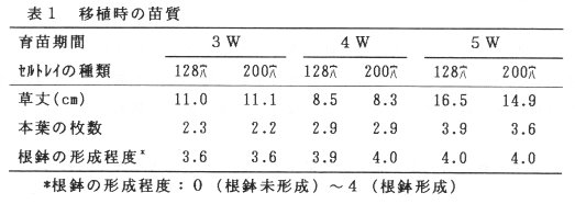 - 本葉の枚数および根鉢の形成程度は、育苗期間が長い5週間(5Wと省略、以下同じ)育苗が優れ、4週間(4W)育苗,3週間(3W)育苗の順となった表1。
