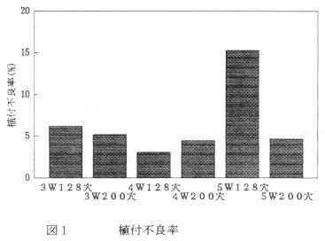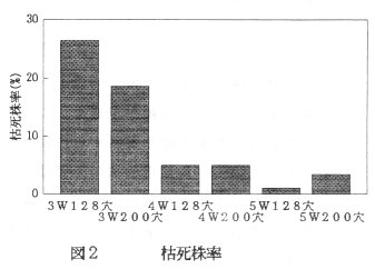 - 移植後の枯死株率は、5W育苗が1番低く、続いて4W育苗であり、3W育苗ではかなり高くなる(図2)。