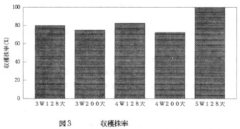 - 収穫株率は、5W育苗が高く、4W育苗、3W育苗ではやや低くなる。セルトレイの比較では、200穴より128穴の方が、収穫株率が高くなる(図3)。