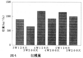 - 収穫量は、128穴セルトレイの4週間苗が1番多く、続いて128穴5週間苗となる(図4)。