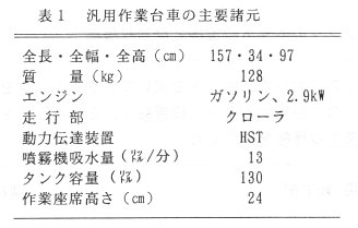 - 本作業台車(表1)は、歩行型クローラ走行防除機の防除タンクを取り外し、速度制御レバー、て地上高24㎝の高さに取り付け、両足を溝底に置いて作業できる(図1、2)。作業しながら手元のレバーで速度制御ができ、苗のせ台を手元近くに置けるようにしている。