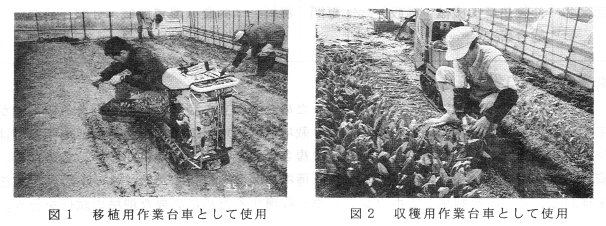 - 作業台車を使用しない慣行方式では、中腰作業が多く、次の地点へ移動のための立ち上がりを必要とし、さらに、苗または収穫物の人力抱え運搬作業が必要であるが、作業台車を使用することにより、座席に腰掛けた状態で移植や収穫などの作業が連続してでき、作業者の負担を軽減する。高さ15㎝の畝では、本機に座乗状態で畝表面60㎝の範囲まで両手での作業が可能である。
