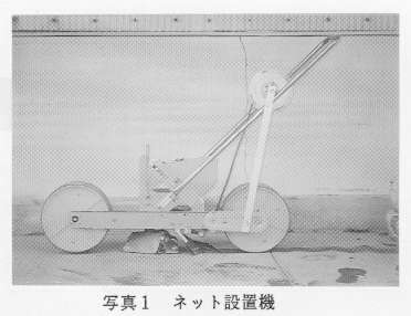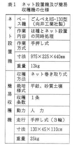 - 市販の手押し式は種機を改良し、ネット設置作業の省力を図るため、手で押すだけで、は種と同時にネットを畝に浅く埋設するネット設置機を試作した。主な改良部分は溝切り装置部で、広幅の溝切り装置内には種と覆土を行い、その上にネットを敷設後更に上に軽く覆土をし、リヤ-ホイ-ルで鎮圧を行うものである(写真1、表1)。