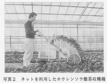 - ネットを利用した手動式のホウレンソウ簡易収穫機を試作した。本機は平畝栽培用の1条収穫機であり、前2輪、後ろ1輪の3輪である。収穫の方法は、右手で本体中央部のネット巻き取りドラムを回転させてホウレンソウを引き抜き、左手で本体を押して前進させながら収穫を行う。ネットを巻き取ることで、根が付いた状態でホウレンソウを引き抜き、本体上部で根を切断後、茎葉部を後部の収穫箱に落下させるものである(写真2、表1)。