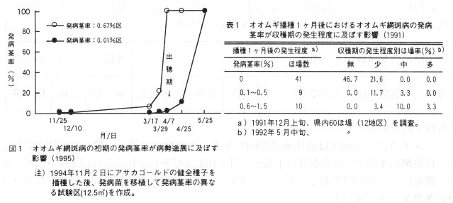 - 本病は播種の約1ヶ月後から種子あるいは被害茎葉からの伝染によって発病し、この時期の発病茎率が高いほど病勢進展は早くから始まり、収穫期の発生程度も高くなる(図1、表1)。